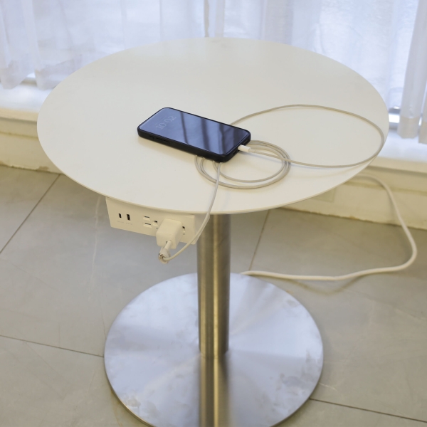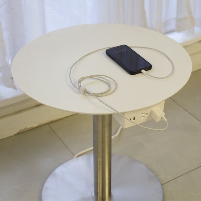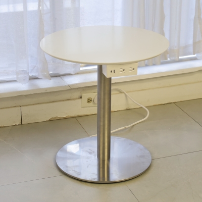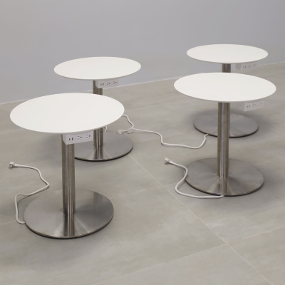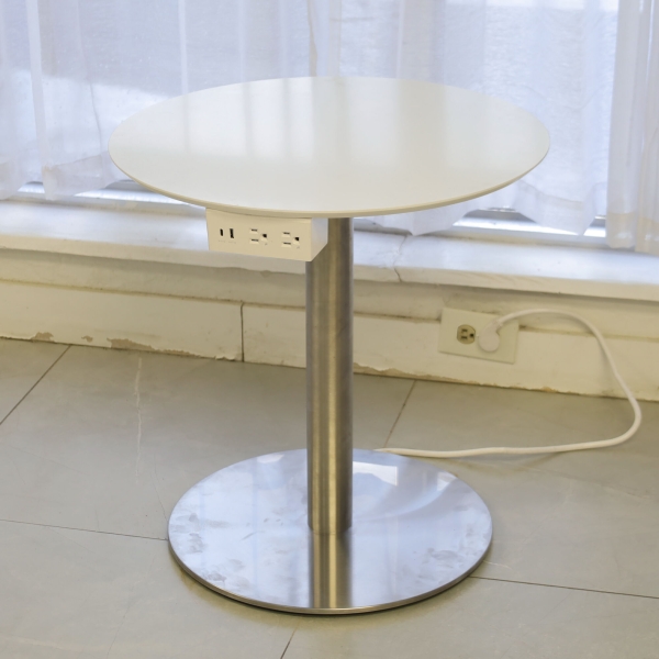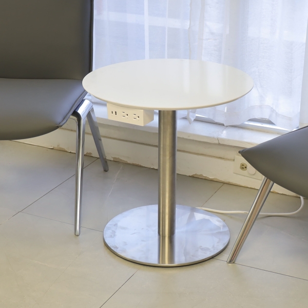 The Aurora Round Side Table combines style and function, offering a customizable engineered surface top in 10 color options. Choose from a sleek silver or black stainless steel base to complement your decor. For added convenience, an optional power box with two power ports, one USB-A, and one USB-C port is available in either white or black. With its commercial-grade construction, this table provides durability and modern versatility, ideal for any professional or personal space.