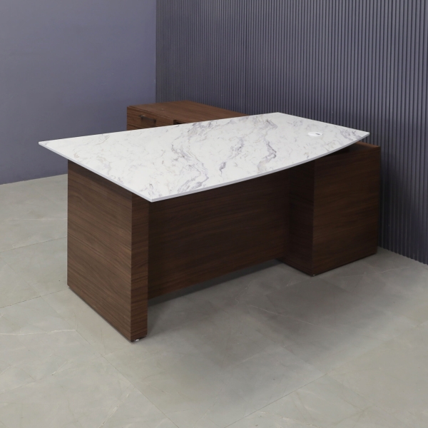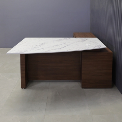 Introducing the Avenue Curved Executive Desk with Credenza and Engineered Surface Top. This sophisticated desk features a 1/2" engineered surface top made from a highly durable and scratch-resistant man-made composite, not real stone. The base and credenza are constructed from a combination of commercial plywood and MDF, ensuring commercial-grade quality.