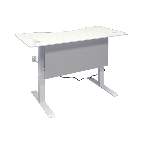Discover the perfect blend of form and function with our aXis Sit-Stand Executive Desk. Its elegant 1/2" engineered stone top offers a choice of nine stunning colors. Opt for grommet holes for cable organization, ensuring a clutter-free workspace. The base features a height range of 27-46 inches, catering to everyone's comfort. Gyro anti-collision technology for safety. Convenient push-button controls with four user-customized positions and up to 250 lb weight capacity warranty. Crafted with highly durable and scratch-resistant surfaces, our executive desks are meticulously designed in our studio. Upgrade your workspace with style and flexibility today.