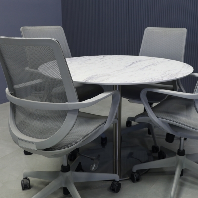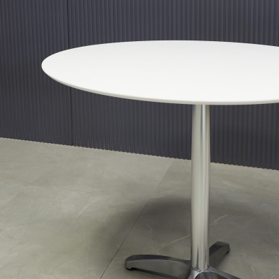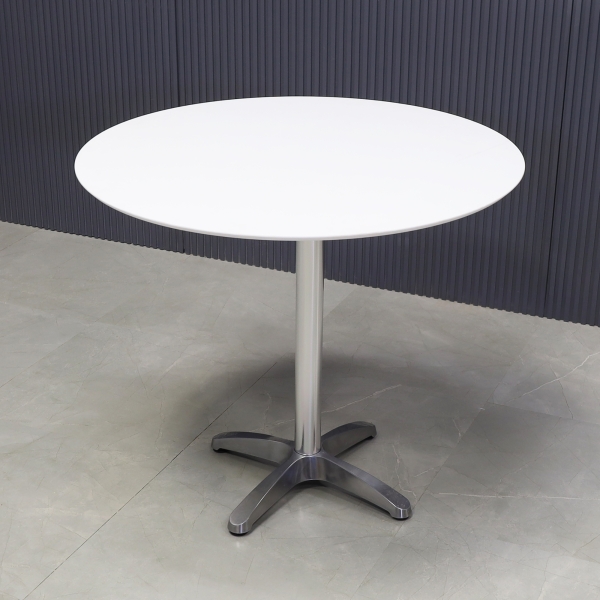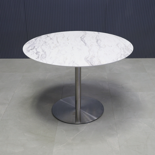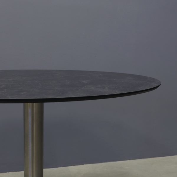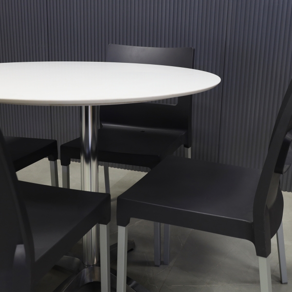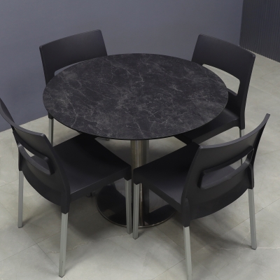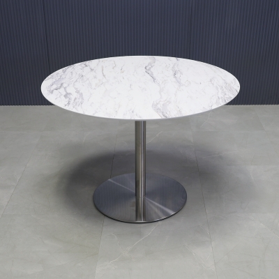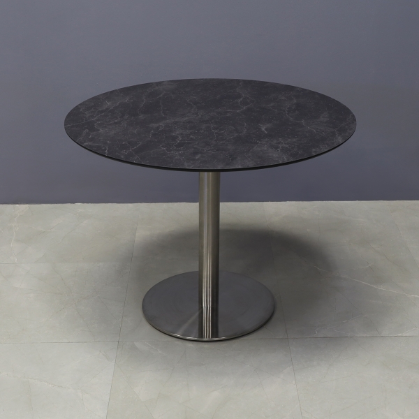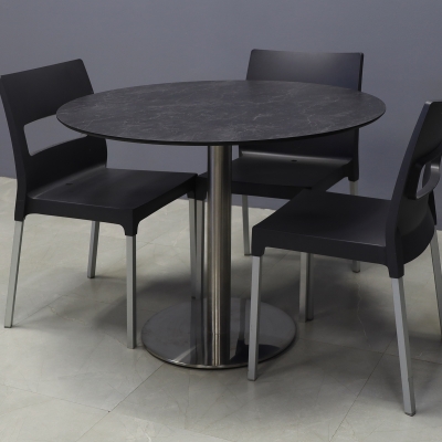 Introducing our new California Round Cafeteria Table, featuring a 1/2" engineered stone top and a sleek brushed stainless steel base. Designed in our studio, this handcrafted table boasts highly durable and scratch-resistant surfaces. Elevate your space with this stylish addition.