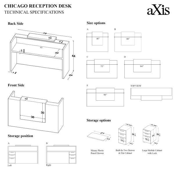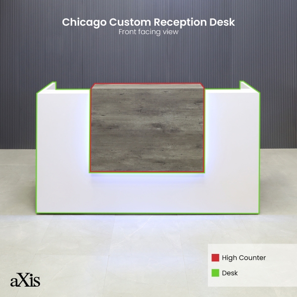 Capture the modern magnificence of a burgeoning firm in the heart of the Chicago Loop. The innovative commercial design of our Chicago Reception Desk brings the style of this famous business district into your company's space. Put your unique spin on this bit of Chicago chic by customizing the desk in your desired look. From your choice of stylish and functional drawers to a variety of size dimensions, you can tailor your reception area to match your brand colors or your industry. To complete your look, try adding a color-changing LED light with remote, to give your lobby a soft ambiance.