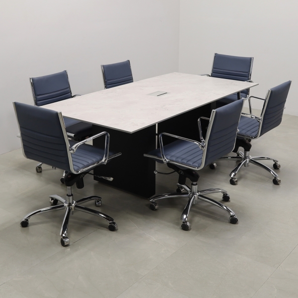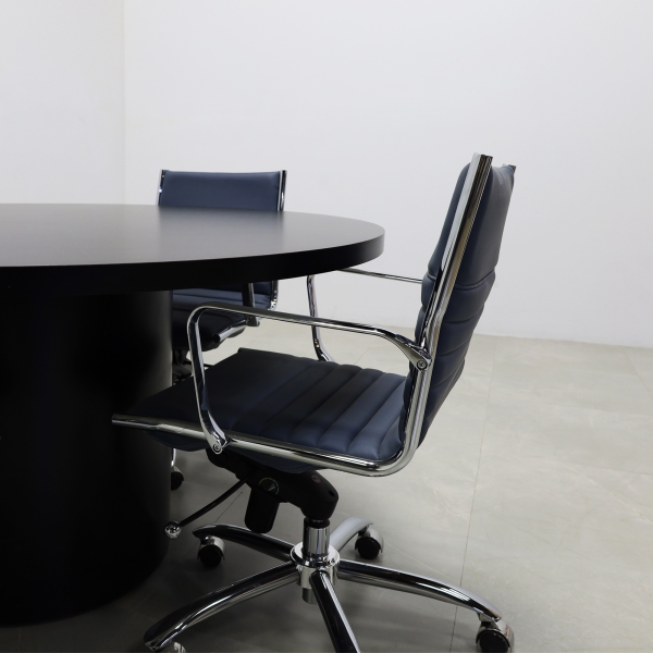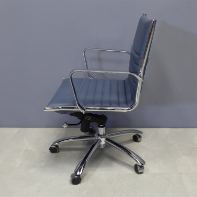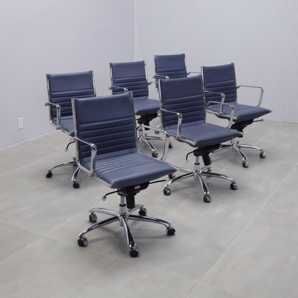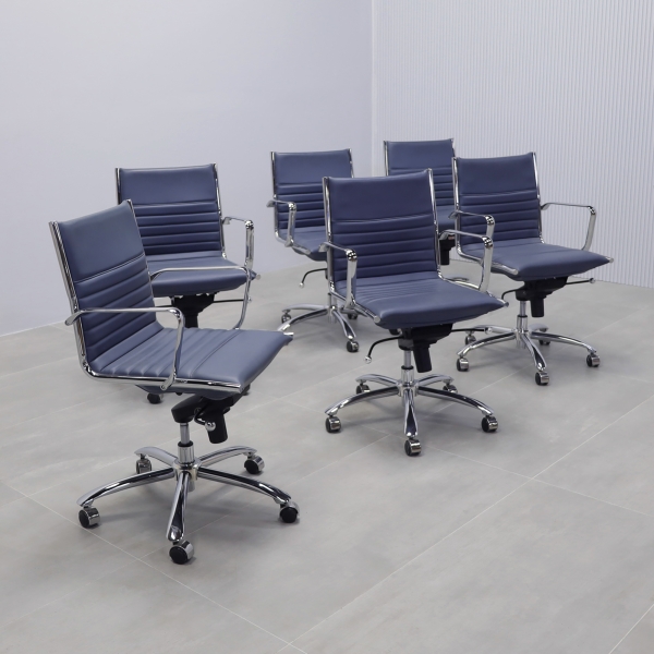 Upgrade your office with a set of six Dirk Low Back Office Chairs in Blue Leatherette. Featuring a sleek design, these chairs offer chromed aluminum armrests for added comfort and a durable steel base and frame for long-lasting use. The blue leatherette upholstery adds a touch of modern elegance to any workspace. As part of our floor model sale, these chairs are available at an unbeatable price. Perfect for conference rooms or office setups, they combine style and functionality. Order this set now and transform your office with comfort and sophistication. Ready to ship!