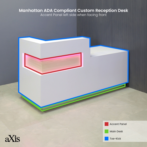 Introducing the Manhattan ADA Compliant Custom Reception Desk - Your Perfect Fit. Available in sizes from 60 to 90 inches, tailored to your needs. Select from a range of laminates to match your style. Crafted from a combination of Plywood and MDF, it's built to last with durable, scratch-resistant surfaces. Designed in our studio and meticulously handmade from scratch, this ADA-compliant reception desk combines accessibility with elegance, making it an excellent choice for your space.