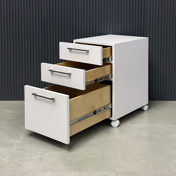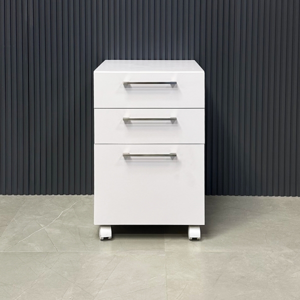 Introducing the Naples Mobile Storage - 15 3/4 inches: an elegant storage solution made of solid plywood and MDF. Its sleek design features a white matte laminate finish. In stock and ready to ship, this storage combines functionality with contemporary aesthetics. Upgrade your space with Naples Mobile Storage today.