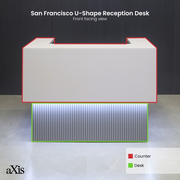 Introducing the San Francisco U-Shape Custom Reception Desk, designed to bring sophistication and functionality to your reception area. Available in 5 sizes, from 48 to 90 inches, this desk is made with a combination of Plywood and MDF. Choose from over 30 laminates and finishes to match your style. Customize further with included white or colored LED lighting, controlled by a remote. Built with commercial-grade construction, this desk is designed and hand-made in our studio for durability and quality. Order your San Francisco U-Shape Custom Reception Desk today!